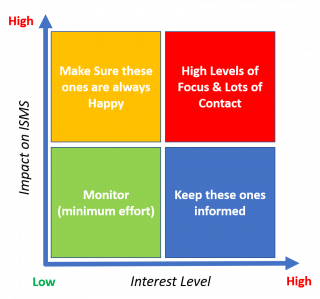 By plotting your interested parties onto a grid like the one shown here you can create a good understanding of how much they impact your systems and how much time you need to put into managing them.