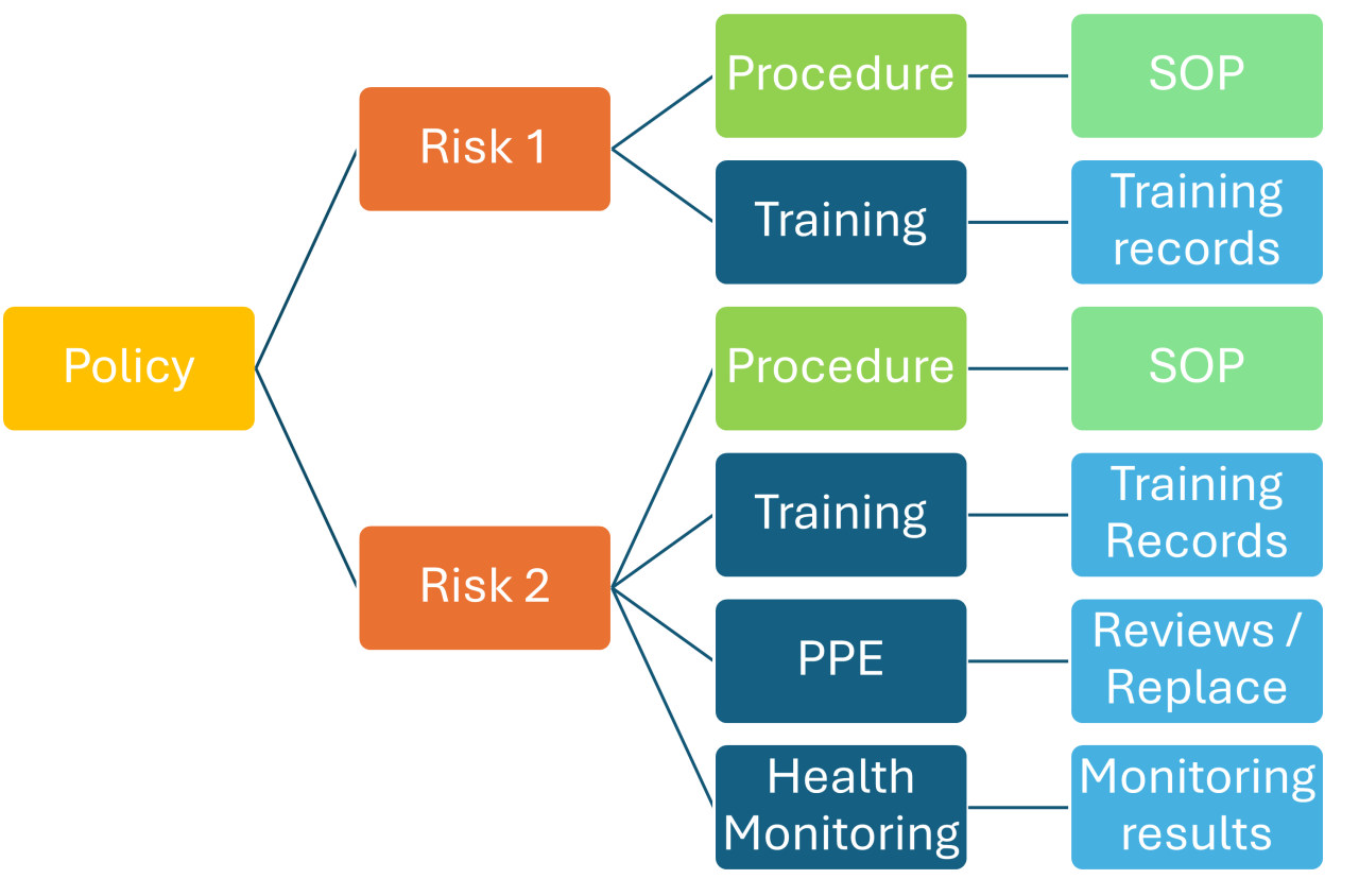 Everything after the risk is effectively a control measure or evidence such as training records, PPE records, Supplier Assessments, internal audits and so forth. That final level only happens to support one of the control measures that you are putting in place to mitigate the risk.