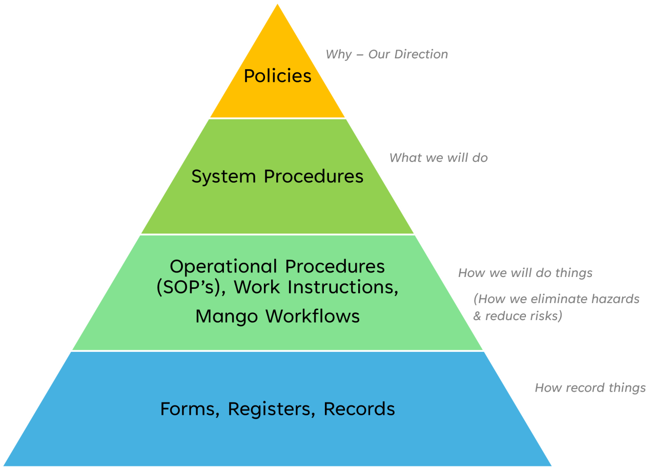 When you look at the vast majority of companies ISO management system, they will list the structure of the system something like the pyramid shown here.
